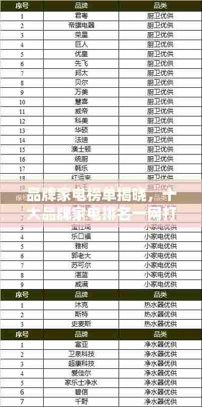 家电市场日新月异,各大品牌竞相创新,为消费者带来众多高质量的产品,本文将为您介绍品牌家电排名前十名,这些品牌凭借其卓越的性能、设计和售后服务赢得了广大消费者的信赖。